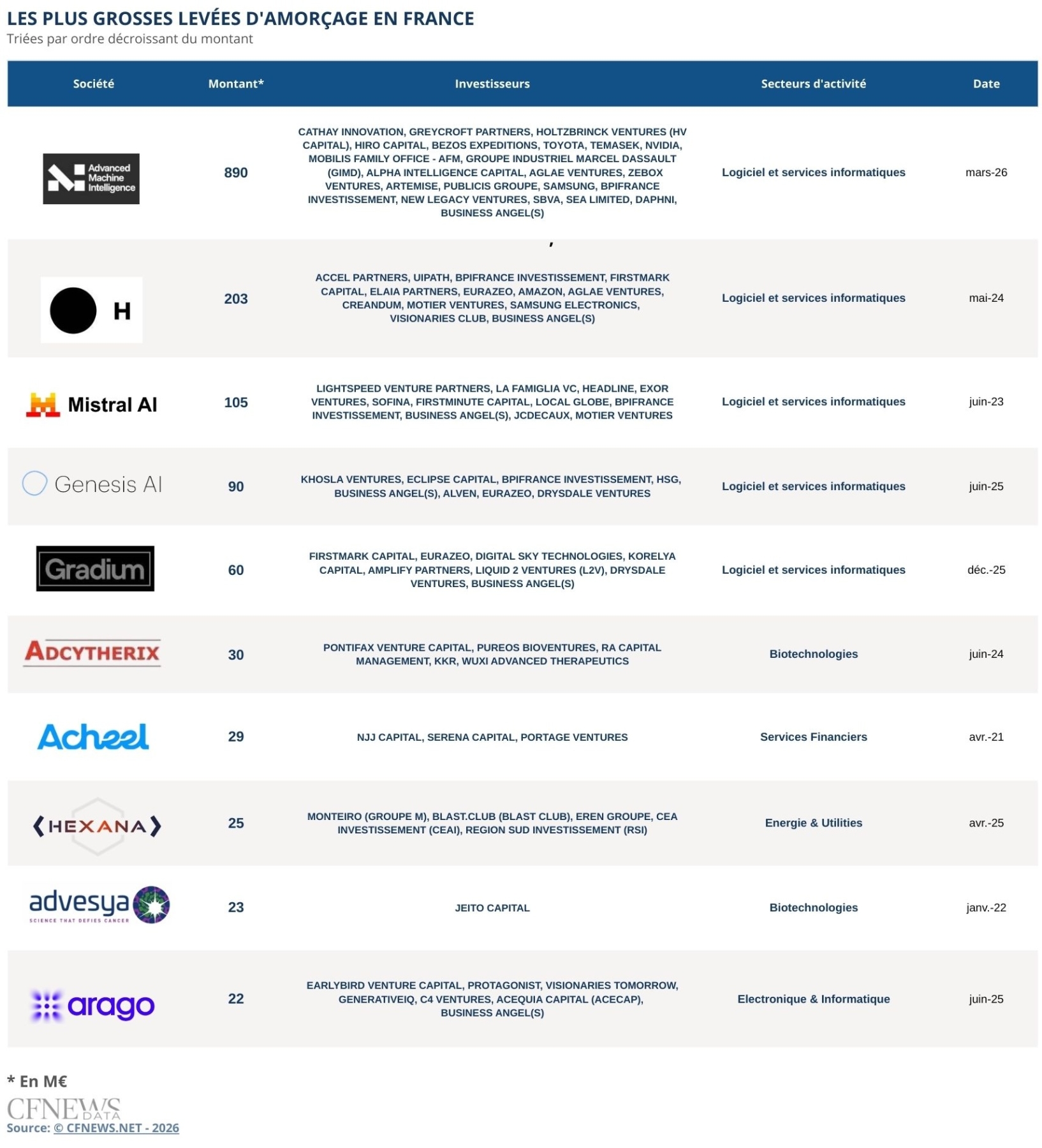 Très rares sont les jeunes pousses européennes levant 890 M€ en phase de venture ou de growth. Mais y parvenir lors d'une première ouverture de capital est inédit, au moins hors des États-Unis où Thinking Machines Lab et Safe Superintelligence, deux entreprises fondées par des anciens d'OpenAI, ont fait mieux. C'est pourtant la performance réalisée par AMI Labs, fondée par six anciens de Meta emmenés par son patron de l'intelligence artificielle jusqu'en novembre 2025, Yann LeCun. La taille de ce tour d'amorçage place d'emblée l'entreprise dans le cercle des licornes, avec une valorisation post money de 3,88 Md€. En comparaison, Mistral, autre pépite française de l'IA, n'avait pas atteint, et dépassé, ce niveau de valorisation avant sa série B.