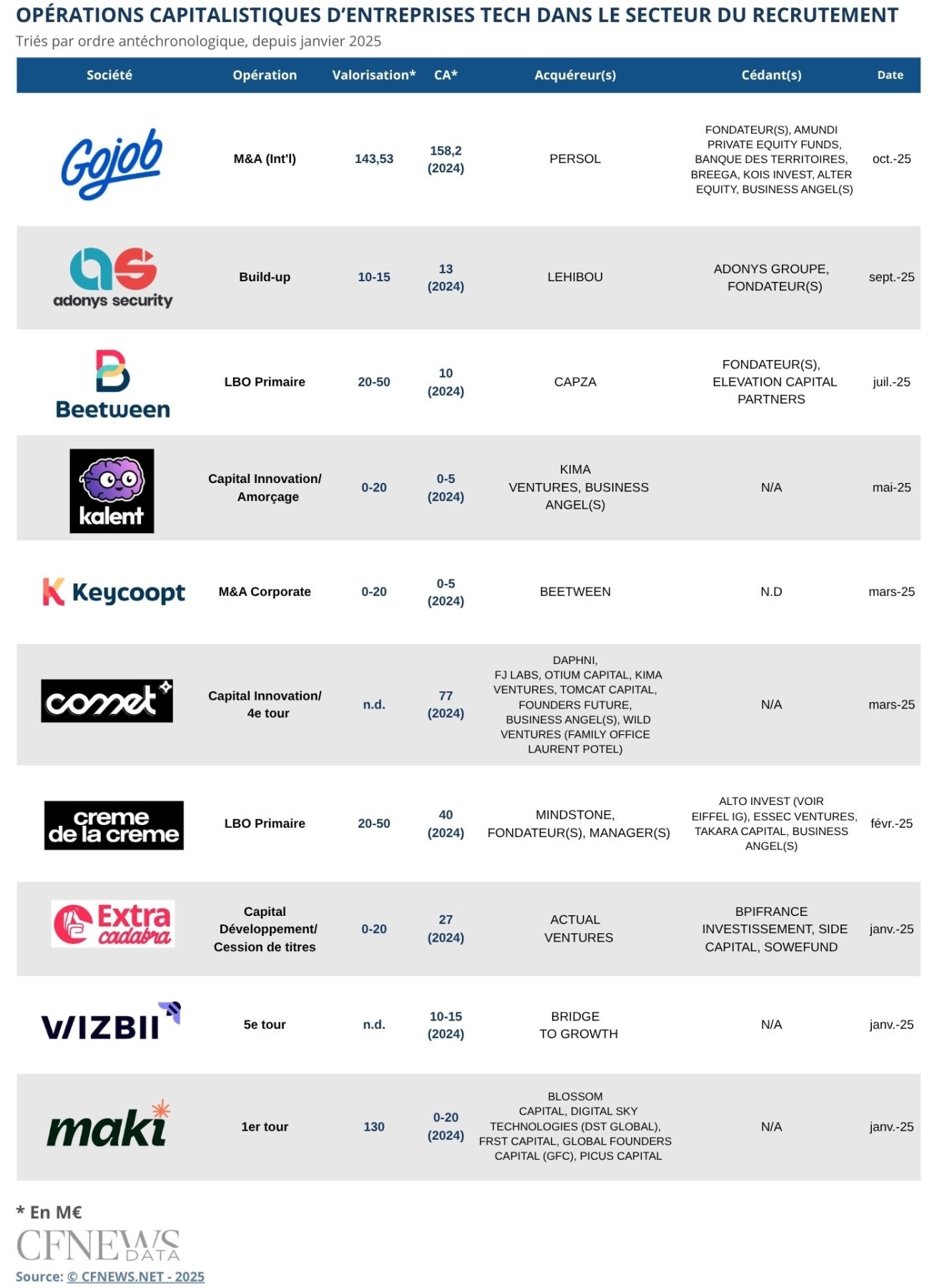 Employant 249 salariés, dont 230 en France, la cible a connu une croissance de 58,2 % de son chiffre d'affaires depuis sa dernière levée en 2022, le portant à 158,2 M€ en 2024, dont 8,9 M€ aux États-Unis. Tablant sur plus de 200 M€ de revenus en fin d'année, elle dégage pour la première fois un Ebitda positif d'1,3 M€ l'année dernière. « À quelques exceptions, la plupart de nos investisseurs ont pour vocation l'amorçage et devaient à un moment donné démontrer du TRI pour relever des fonds. Cela faisait un moment que nos actionnaires nous encourageaient vers cette démarche. D'un autre côté, la société arrive à un degré de maturité avec un actionnariat atteignant un plafond de verre, qui n'était plus capable de nous accompagner dans la phase de scale-up. L'autre alternative aurait été d'entrer en bourse, mais l'entreprise est encore jeune pour cette étape-là. Plusieurs fonds importants se sont manifestés, mais leurs thèses n'entraient pas dans notre philosophie à impact », témoigne Pascal Lorne. Travaillant avec un millier de clients dans les secteurs de la distribution, de l'industrie ou encore de la logistique, Gojob pilote 10 000 missions par mois. L'entreprise développe depuis 10 ans une plateforme de recrutement identifiant les travailleurs temporaires les plus pertinents pour répondre aux besoins personnalisés des sociétés, en proposant des candidats en fonction des compétences requises et de la géographie. Sur les dernières années, l'outil a enrichi ses fonctionnalités de personnalisation au moyen de l'intelligence artificielle.