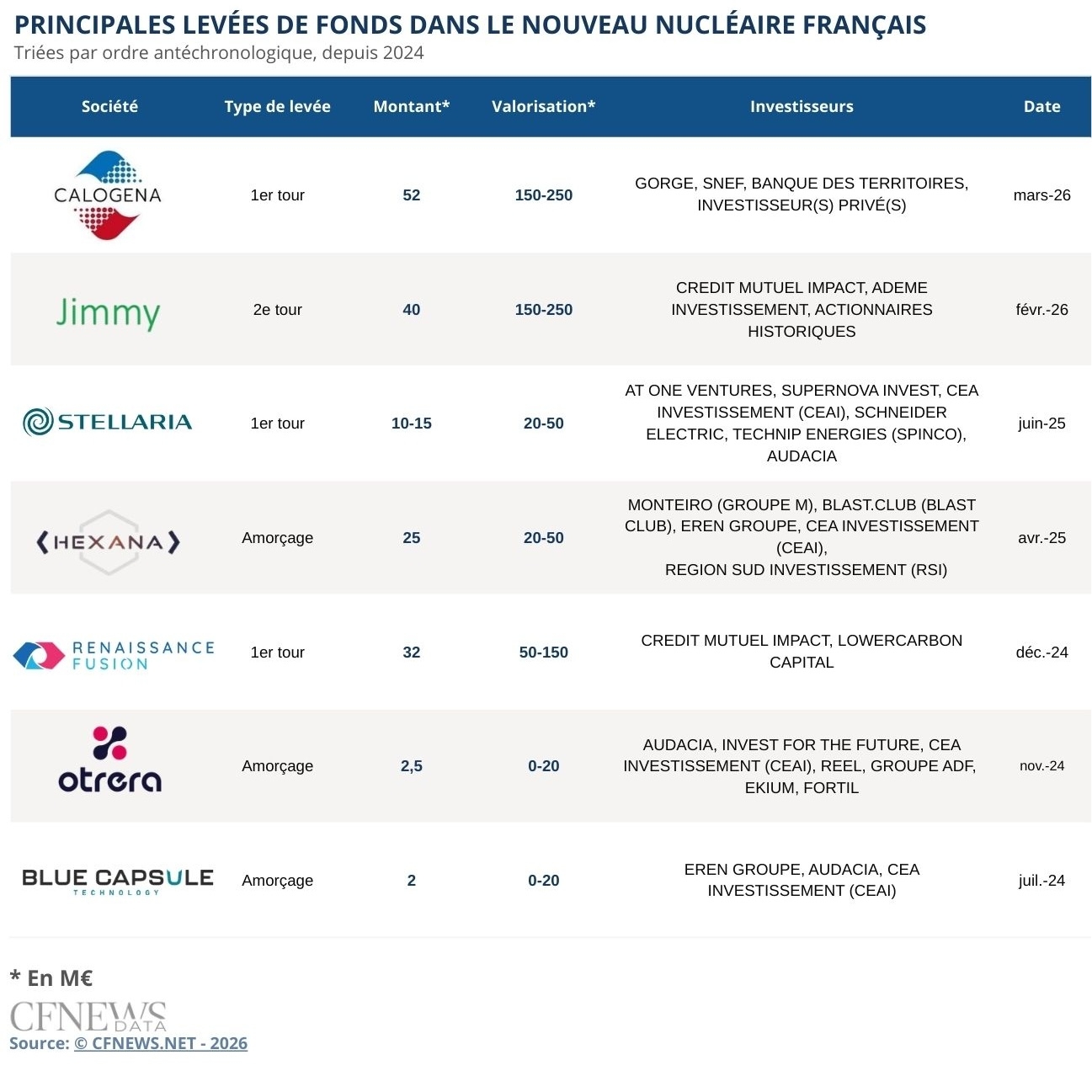 L'étape fatidique approche pour Jimmy Energy. La start-up concevant un SMR pour fournir de la chaleur industrielle bénéficie d'une nouvelle levée de 40 M€ et d'une subvention de 40 M€ supplémentaires décrochée dans le cadre de la phase 2 du programme « réacteurs nucléaires innovants » de France 2030. Le tout servira à porter la société jusqu'au lancement de la construction d'un premier réacteur à horizon 2028-2029. Pas de fonds d'infrastructure pour l'instant présent dans le tour — comme éventuellement envisagé lors du précédent de 15 M€ en 2022 — mais un investisseur au profil evergreen : Crédit Mutuel Impact est le meneur à travers le Fonds Révolution Environnementale et Solidaire, abondé par le dividende sociétal de Crédit Mutuel Alliance Fédérale. Il est suivi d'Ademe Investissement ainsi que des historiques Eren Groupe, Noria, Polytechnique Ventures et Otium Capital.