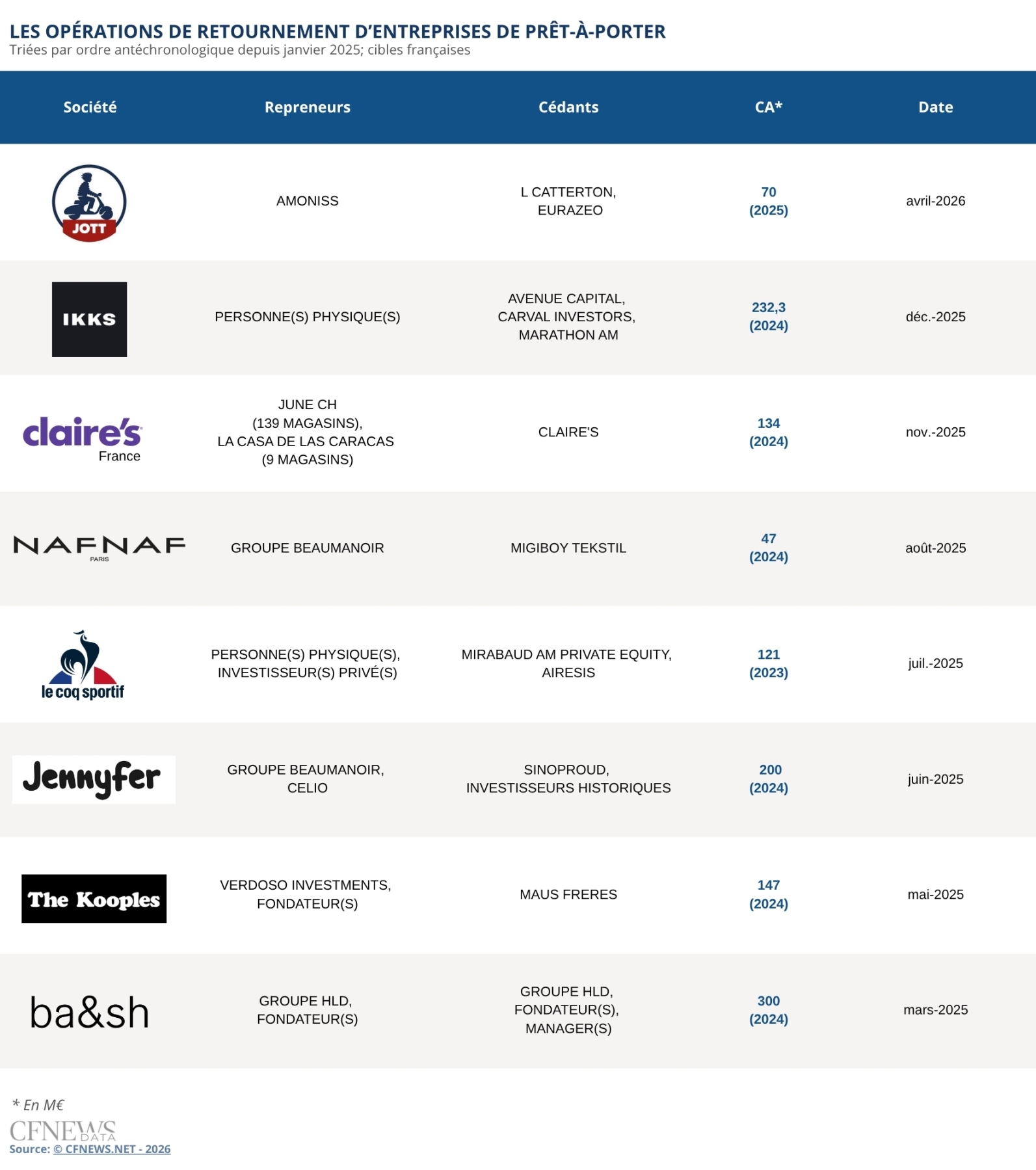 Jott (Just over the top) remonte en selle. La célèbre marque marseillaise de doudounes, dont le logo représente un homme sur une Vespa, a connu une sortie de route rapide après son LBO primaire conclu début 2021 par L Catterton pour 240 M€. Après sa cession de paiements le 18 décembre 2025, une procédure de redressement judiciaire a été ouverte le 22 janvier 2026, supervisée par Frédéric Avazeri d’Ajilink. La société, qui a affiché 75 M€ de chiffre d’affaires en 2025, a attiré 16 offres début février, mais seules cinq ont été retenues. Sur ces candidats à la reprise, deux se sont retirés avant le jugement du tribunal de commerce de Marseille, prononcé ce 13 avril. Celui-ci est favorable à Amoniss, la holding industrielle de Salih Halassi, un entrepreneur qui a créé ou repris plusieurs PME dans le secteur du textile, comme Bacotim (impression sur tissu) et Kindy (fabricant de chaussettes). Il est aujourd’hui à la tête d’un groupe de quelque 220 M€ de chiffre d’affaires agrégé, selon nos informations, dont la principale filiale est Pimkie, mais qui comprend également Chevignon, Lepape ou encore Christine Laure. « Amoniss a su convaincre par son expertise du secteur, avec des réseaux et un track record dans le retournement réussi d’entreprises, suggère Xavier Péraldi, directeur associé chez Pax Corporate Finance, qui a été son conseil sur ce dossier. Dans le cadre du calendrier resserré de la procédure collective, Salih Halassi a su identifier très rapidement le périmètre à reprendre et les leviers pour relancer l’activité. »