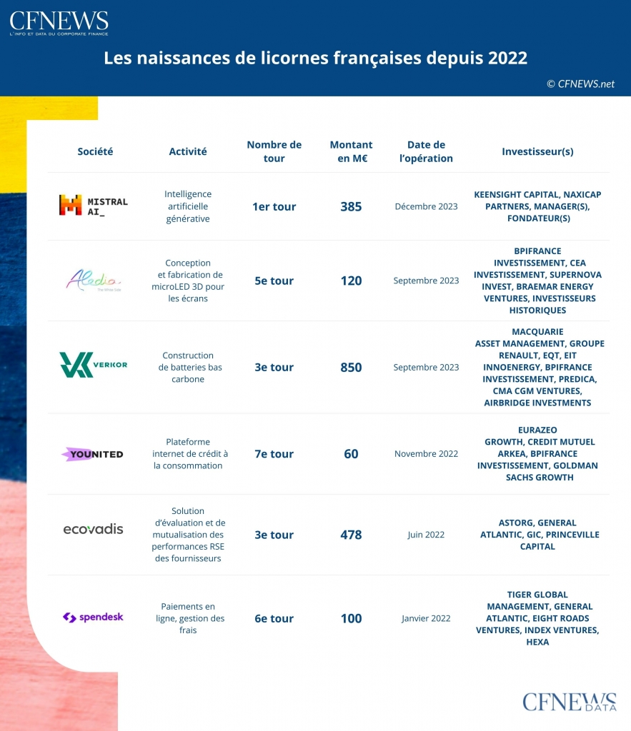 Comme aux plus belles heures de 2021, Mistral AI signe deux tours en moins de 12 mois et devient licorne. Un parcours remarquable en cette période morose pour le financement de la tech, d'autant plus que l'immatriculation de la jeune pousse d'intelligence artificielle générative date de fin avril. Elle lève une série A de 385 M€ en deux tranches, menée par le nouvel entrant a16z (Andreessen Horowitz), devant un autre VC californien, Lighstpeed Venture Partners, déjà actionnaire et qui renforce significativement sa participation de plus gros fonds actionnaire. Le ticket d'a16z serait supérieur à la moitié du tour. Se font aussi une place au capital General Catalyst, Emerson Collective, Conviction, Salesforce, BNP Paribas, CMA-CGM et le business angel Elad Gil, co-fondateur de Color Genomics. Tous les investisseurs déjà au capital ne remettent pas au pot, contrairement, parmi d'autres restés anonymes, aux français Bpifrance, New Wave et Motier Ventures, à l'allemand La Famiglia, au belge Sofina et à Eric Schmidt, l'ancien patron de Google.